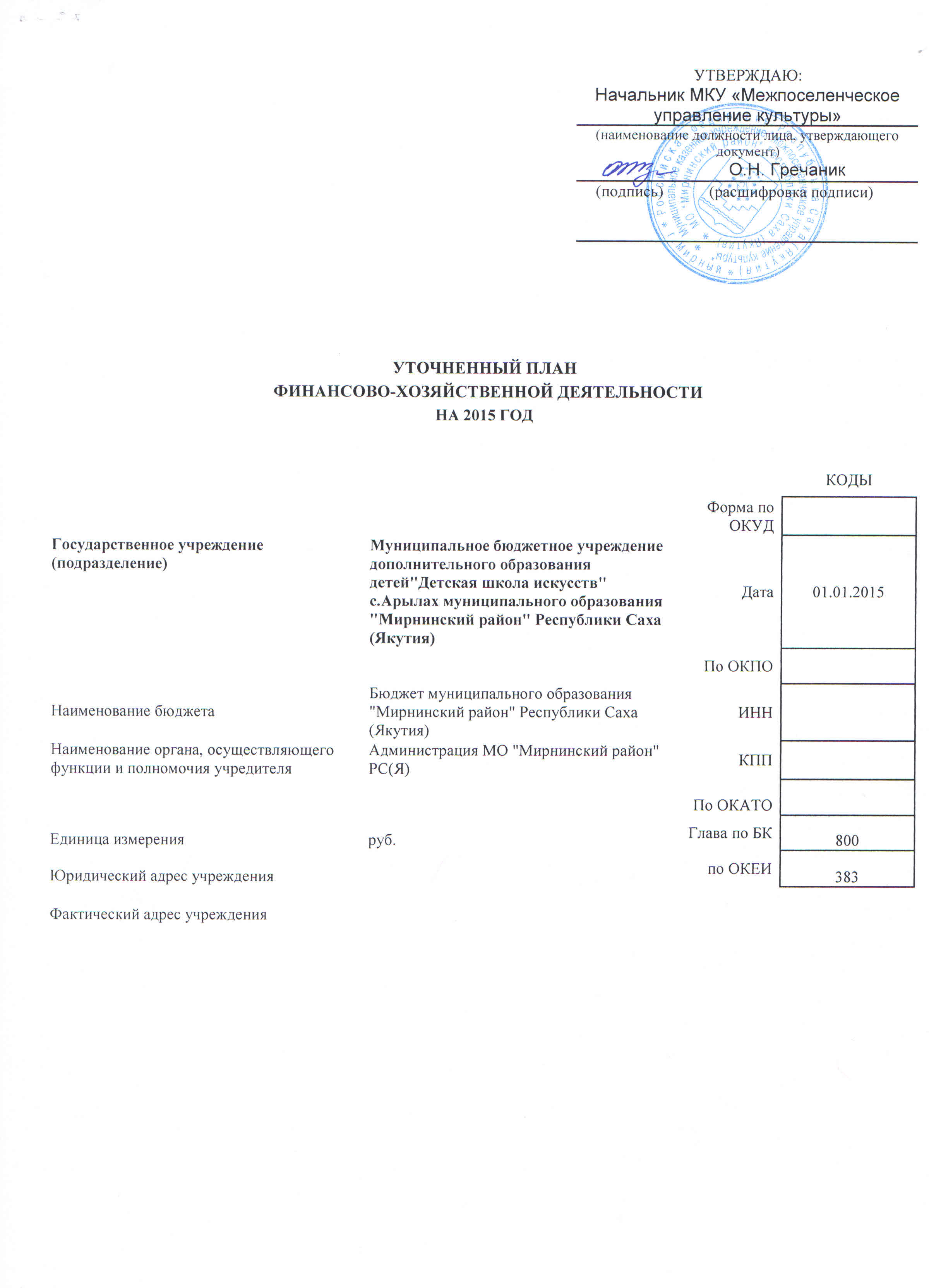 План финансово-хозяйственной деятельности ДШИ с.Арылах на 2015 год